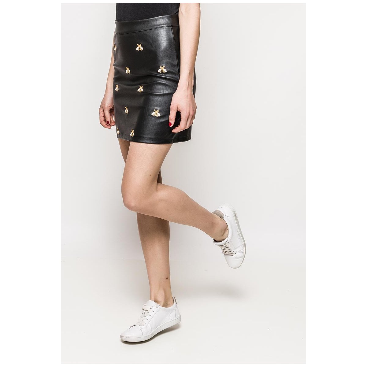 Jupe en simili cuir noir avec motif abeilles imprimé sur le devant. Fermeture éclair dans le dos.